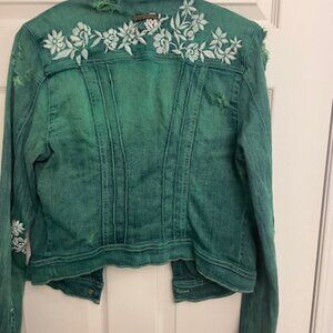 Guess distressed look denim jacket with embroidery flowers in the back. It is creatively distressed in a faded turquoise colour. Truely one of a kind! Size medium but fits small.