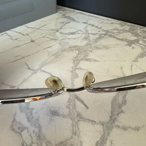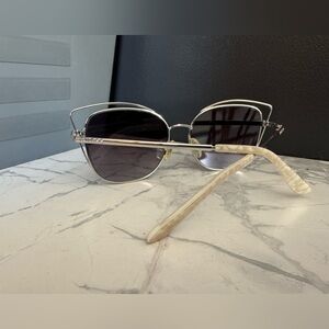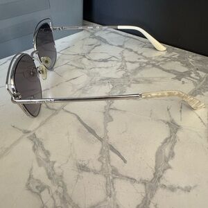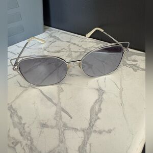 Silver metal cat eye sunglasses - style GU7528 from Guess. Yellowing in the nose pads due to age - only worn a few times, as I need prescription lenses. These are non prescription - mirror style lenses. Good used condition- some minor scratches in the lenses are present. Does not come with the original case.