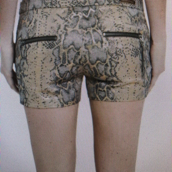 Low rise flat front shorts in a metallic python jacquard. Two side pockets. Two back zipper pockets. One placket has fringe zipper pull. Zip fly with hidden hook and bar closure