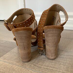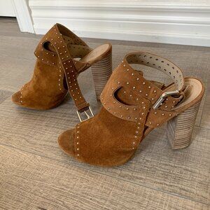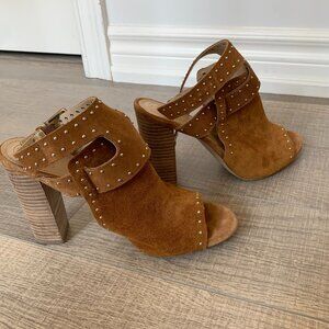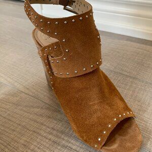 Guess peep toes with block heel. Faux copper suede with silver studs and silver buckle ankle closure. Open heel, size 8. Used but fair condition.