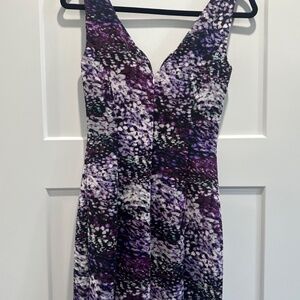 Size 4. Purple multicoloured plunge dress with lining and structured at deep plunge. Back zipper. Worn once for an occasion.