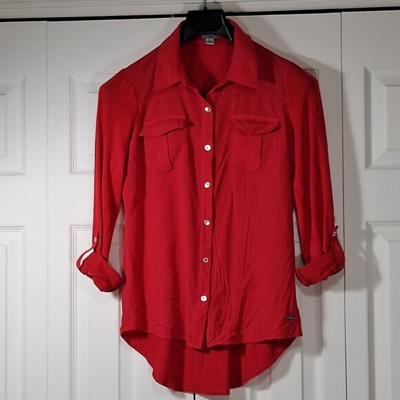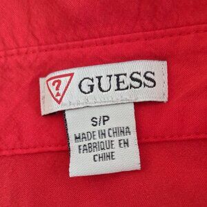 Red Guess shirt/sweater. The sleeves can be adjusted in 3/4 lengths with a loop and a button. The sleeves and back are made of stretch fabric. All buttons are engraved with GUESS. A small metal plaque with the name GUESS is on the lower left front.
