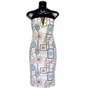 Description: This strapless body con tight dress features art deco pattern w chain, chain tie up at chest, zip back closure. Can be an occasion dress: weddings, grad, party, dates.