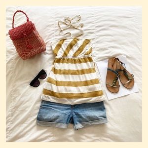 White and gold strapless Guess top, with neck and waist ties. Size labelled as XS. Perfect for hot summery days 🥵. The good fabric is metallic shimmery ✨