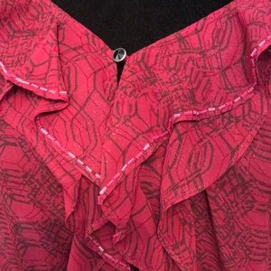Sheer flowy fabric with adjustable spaghetti straps. Raspberry colour. Ruffled front detailing has small beads along the edge with black crystal buttons down the centre. Shirt has very subtle shimmer in the fabric.