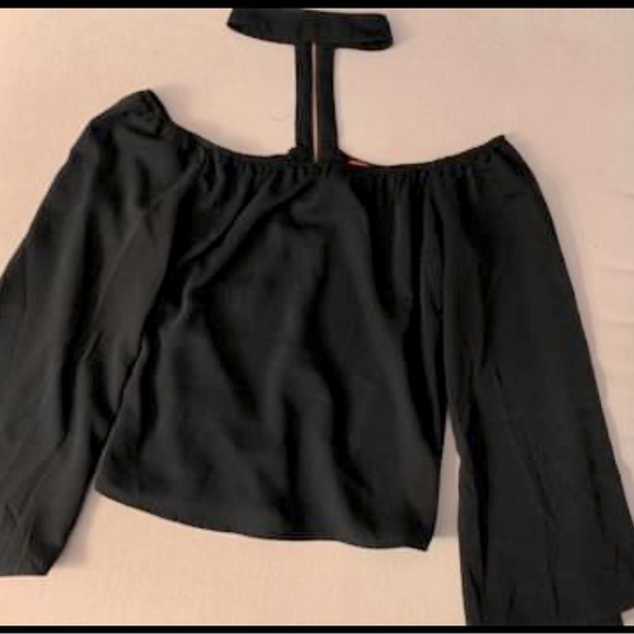 Flowy black top with bell sleeves, and choker.