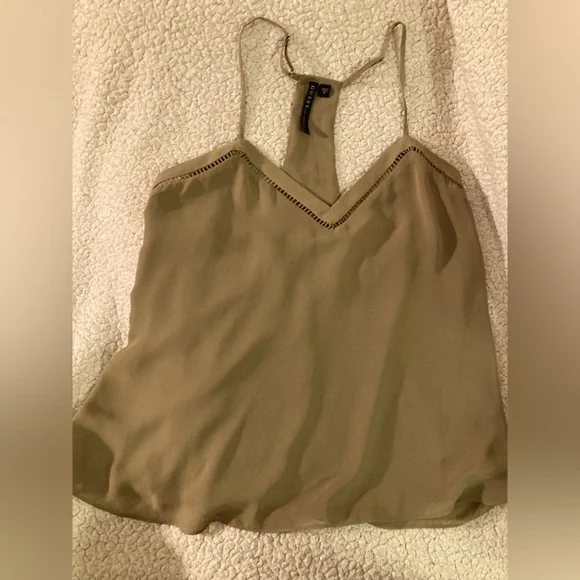 2 layers of sheer fabric, adjustable spaghetti straps, flowy top in light olive green. New without tags