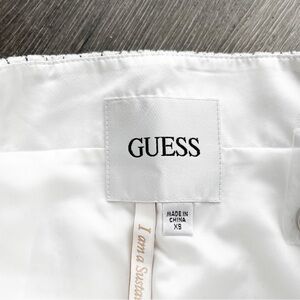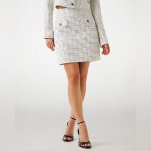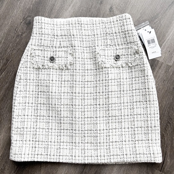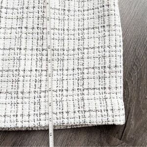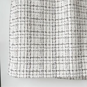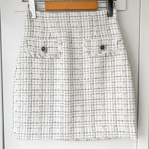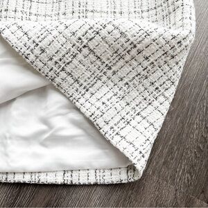 White, black and gold woven tweed fabric. Mini length. Lined. So chic and Chanel-esque.