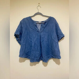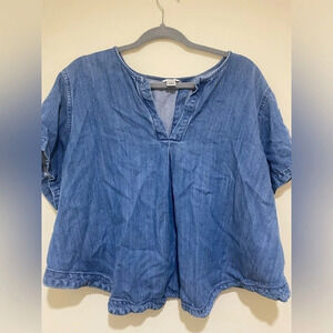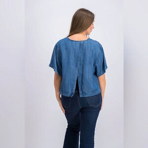 Guess women’s spilt neck short sleeve denim blue blouse with open back size L