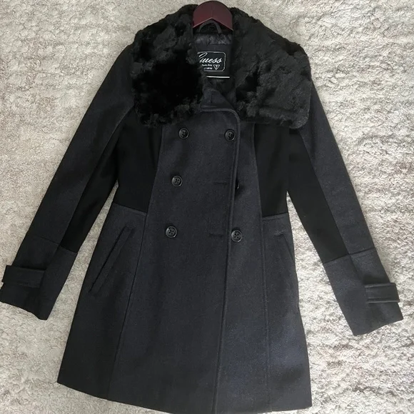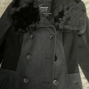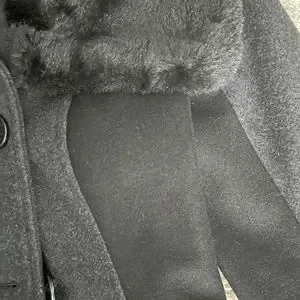 A beautiful grey and black detail wool jacket with black trim fir around the collar. Double breasted buttons. In mint condition.