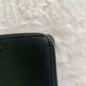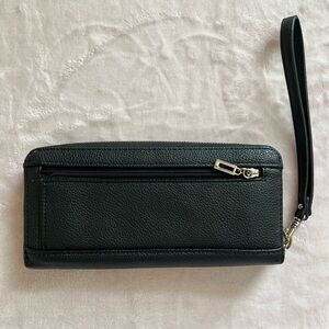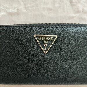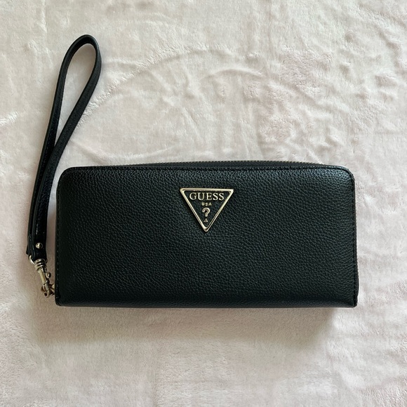 Black Guess wristlet that’s in good condition. Minimal signs of wear on the purse itself. Some leather peeling on the corner (as shown in the picture), gold hardware in good condition as well.