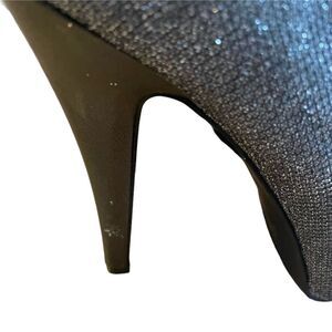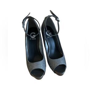 Used Guess high heel silver sparkly shoes. Five inch heels. Please refer to pictures for some marks on one of the heels
