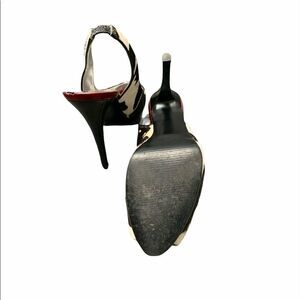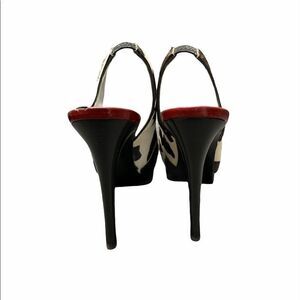 Gorgeous Guess pony hair platform sling backs in a red, black and white cow skin design great for this seasons trend. These shoes have been gently used.