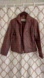 Striking burgundy-brown snake-print genuine leather jacket with full metal zip front. Subtle shoulder pads add structure; two shallow front zip pockets plus one interior open pocket. Excellent condition — supple leather, no rips or stains. Dry-clean by leather specialist only.
