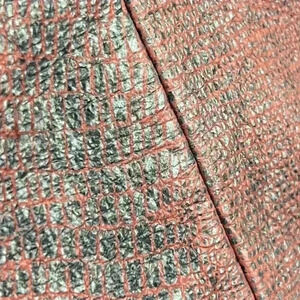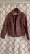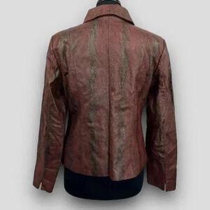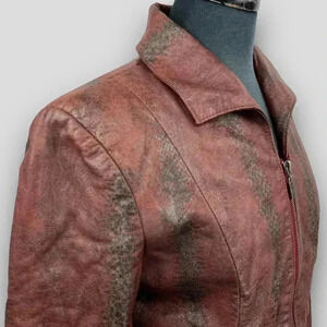 Striking burgundy-brown snake-print genuine leather jacket with full metal zip front. Subtle shoulder pads add structure; two shallow front zip pockets plus one interior open pocket. Excellent condition — supple leather, no rips or stains. Dry-clean by leather specialist only.