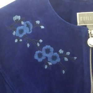Women’s suede embroidered jacket is a stand out. Rare colour from past Guillaume collection. Collarless with zip front, cut to flatter the figure. Fully lined, two front pockets, two inside pockets Sleeve cuffs can be rolled up to reveal embroidery detail or left down. Never worn. NWOT. Size Large
