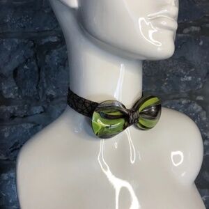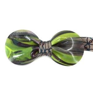 Years of expertise go into each lightweight polymer and luxury silk one-of-a-kind bow tie. The world's only truly sculpted bow tie. The silk is from repurposed vintage designer silk ties and scarves from the 1950s-2000s, thereby saving this incredible fabric from ending up in landfills. Each tie is sculpted one at a time, without the use of a mould. All the colours are created individually in polymers prior to being sculpted and fired, and are combined one at a time through classic sculpting techniques to achieve the final piece. There is no painting involved in a Guillotine tie. Each piece is signed and named and then attached to the hand-sewn silk neck strap. Guillotine bows are truly couture, wearable fine art. Bow Size: 4 inches. Strap Dimensions (adjustable standard): 10 - 20 inches.