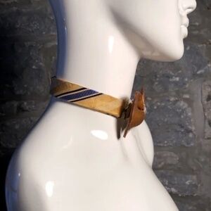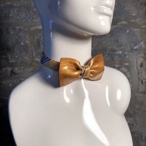 Years of expertise go into each lightweight polymer and luxury silk one-of-a-kind bow tie. The world's only truly sculpted bow tie. The silk is from repurposed vintage designer silk ties and scarves from the 1950s-2000s, thereby saving this incredible fabric from ending up in landfills. Each tie is sculpted one at a time, without the use of a mould. All the colours are created individually in polymers prior to being sculpted and fired, and are combined one at a time through classic sculpting techniques to achieve the final piece. There is no painting involved in a Guillotine tie. Each piece is signed and named and then attached to the hand-sewn silk neck strap. Guillotine bows are truly couture, wearable fine art. Bow Size: 4 inches. Strap Dimensions (adjustable standard): 10 - 20 inches.