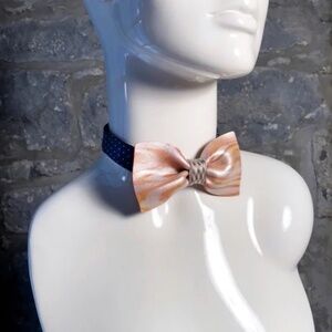 Years of expertise go into each lightweight polymer and luxury silk one-of-a-kind bow tie. The world's only truly sculpted bow tie. The silk is from repurposed vintage designer silk ties and scarves from the 1950s-2000s, thereby saving this incredible fabric from ending up in landfills. Each tie is sculpted one at a time, without the use of a mould. All the colours are created individually in polymers prior to being sculpted and fired, and are combined one at a time through classic sculpting techniques to achieve the final piece. There is no painting involved in a Guillotine tie. Each piece is signed and named and then attached to the hand-sewn silk neck strap. Guillotine bows are truly couture, wearable fine art. Bow Size: 4 inches. Strap Dimensions (adjustable standard): 10 - 20 inches.
