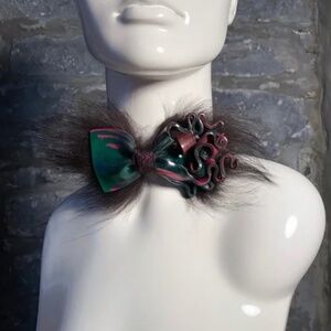 The “Select Series” is Guillotine’s couture collection - the ultimate in luxury and creativity. Years of expertise go into each lightweight polymer and luxury silk one-of-a-kind bow tie. The world's only truly sculpted bow tie. The silk is from repurposed vintage designer silk ties and scarves from the 1950s-2000s, thereby saving this incredible fabric from ending up in landfills. Each tie is sculpted one at a time, without the use of a mould. All the colours are created individually in polymers prior to being sculpted and fired, and are combined one at a time through classic sculpting techniques to achieve the final piece. There is no painting involved in a Guillotine tie. Finished in repurposed mountain goat fur Each piece is signed and named and then attached to the hand-sewn silk neck strap. Guillotine bows are truly couture, wearable fine art. Bow Size: 6 inches. Strap Dimensions (adjustable standard): 10 - 20 inches.