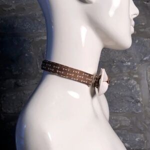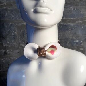 Years of expertise go into each lightweight polymer and luxury silk one-of-a-kind bow tie. The world's only truly sculpted bow tie. The silk is from repurposed vintage designer silk ties and scarves from the 1950s-2000s, thereby saving this incredible fabric from ending up in landfills. Each tie is sculpted one at a time, without the use of a mould. All the colours are created individually in polymers prior to being sculpted and fired, and are combined one at a time through classic sculpting techniques to achieve the final piece. There is no painting involved in a Guillotine tie. Each piece is signed and named and then attached to the hand-sewn silk neck strap. Guillotine bows are truly couture, wearable fine art. Bow Size: 4 inches. Strap Dimensions (adjustable standard): 10 - 20 inches.