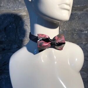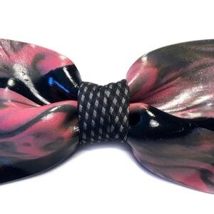 Years of expertise go into each lightweight polymer and luxury silk one-of-a-kind bow tie. The world's only truly sculpted bow tie. The silk is from repurposed vintage designer silk ties and scarves from the 1950s-2000s, thereby saving this incredible fabric from ending up in landfills. Each tie is sculpted one at a time, without the use of a mould. All the colours are created individually in polymers prior to being sculpted and fired, and are combined one at a time through classic sculpting techniques to achieve the final piece. There is no painting involved in a Guillotine tie. Each piece is signed and named and then attached to the hand-sewn silk neck strap. Guillotine bows are truly couture, wearable fine art. Bow Size: 4 inches. Strap Dimensions (adjustable standard): 10 - 20 inches.