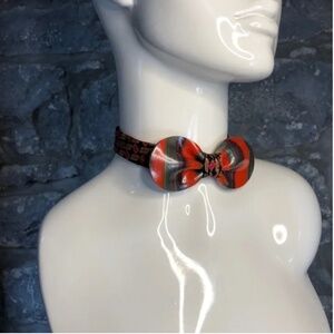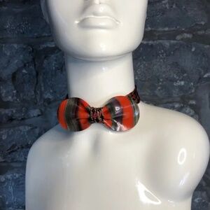 Years of expertise go into each lightweight polymer and luxury silk one-of-a-kind bow tie. The world's only truly sculpted bow tie. The silk is from repurposed vintage designer silk ties and scarves from the 1950s-2000s, thereby saving this incredible fabric from ending up in landfills. Each tie is sculpted one at a time, without the use of a mould. All the colours are created individually in polymers prior to being sculpted and fired, and are combined one at a time through classic sculpting techniques to achieve the final piece. There is no painting involved in a Guillotine tie. Each piece is signed and named and then attached to the hand-sewn silk neck strap. Guillotine bows are truly couture, wearable fine art. Bow Size: 4 inches. Strap Dimensions (adjustable standard): 10 - 20 inches.