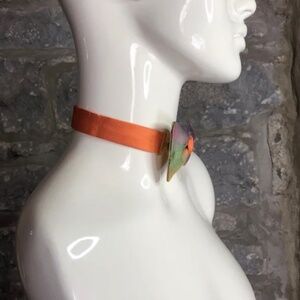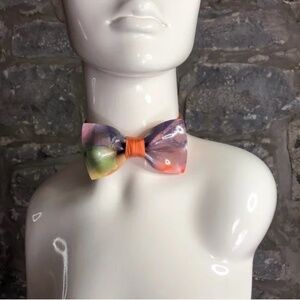 Years of expertise go into each lightweight polymer and luxury silk one-of-a-kind bow tie. The world's only truly sculpted bow tie. The silk is from repurposed vintage designer silk ties and scarves from the 1950s-2000s, thereby saving this incredible fabric from ending up in landfills. Each tie is sculpted one at a time, without the use of a mould. All the colours are created individually in polymers prior to being sculpted and fired, and are combined one at a time through classic sculpting techniques to achieve the final piece. There is no painting involved in a Guillotine tie. Each piece is signed and named and then attached to the hand-sewn silk neck strap. Guillotine bows are truly couture, wearable fine art. Bow Size: 4 inches. Strap Dimensions (adjustable standard): 10 - 20 inches.