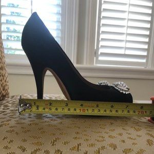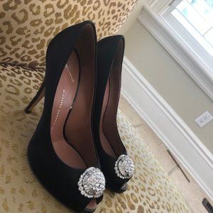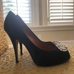 Black satin Guiseppe Zanotti peep toe pumps, with rhinestone buckle details.
