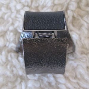 This two-tone asymmetrical hinged cuff bracelet is a statement-making piece. Designed with a textured gunmetal and faux leather finish. Secure spring-loaded hinge closure. The bracelet is in very good pre-owned condition. Very minor overall wear. No surface scratches or discoloration.