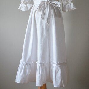 A gorgeous midi prairie dress with quarter length bishop sleeves, a plunge neckline, and gorgeous lace/bead detail!