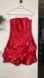 It doesn’t have a fabric tag, but the fabric looks and feels like satin. It has plastic boning in it that gives it shape and the ruffles are just gorgeous. It will need to be pressed and cleaned before wearing.