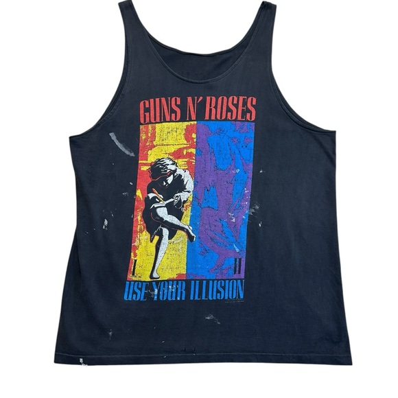 Guns N’ Roses Use Your Illusion tank top featuring the iconic album artwork in bold primary colors. Originally a T-shirt and professionally converted into a tank, giving it a clean finish and perfect summer fit. True rock-n-roll attitude with authentic distressing + natural fading — ideal for grunge looks, festival fits, and vintage band tee collectors.