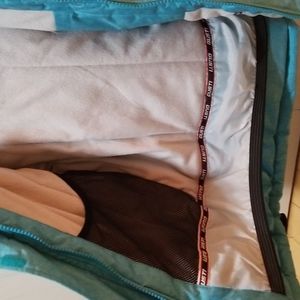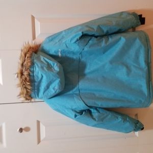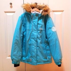 This beautiful teal light blue coat is lined with a soft cozy fabric. The faux fear on the hood is removable. Built in snow guard elastic around the interior waist. Two zipped pockets on the outside and 2 hidden pockets on the inside. Great for recess, or hitting the slopes. Sturdy zipper and velcro closure. This jacket is in like new condition.