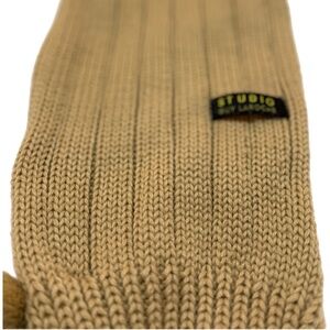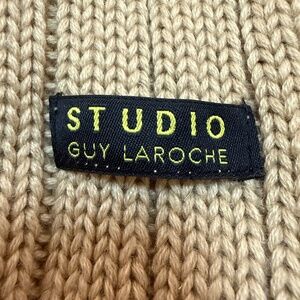 levate your winter style with this sophisticated Studio Guy Laroche scarf. Guy Laroche is a renowned French fashion house known for its elegant and timeless designs, bringing a touch of Parisian chic to your wardrobe. While the materials label is missing, the soft knit feels like high-quality wool, and the large, plush pom poms appear to be real fur, likely rabbit. This scarf is in excellent, like-new condition, featuring a timeless design and a beautiful neutral hue. The unique pom pom details add a touch of playful elegance.