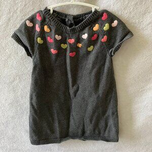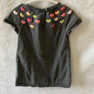 Gymboree Outlet toddler knit dress, size 2T. 100% cotton. Sweater knit in charcoal grey, with colourful embroidered hearts. Cap sleeves and ribbed trim with a single-button closure at the back.