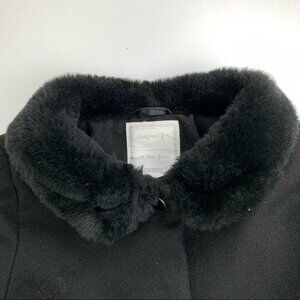 Such a sweet little coat with a faux fur collar and heart shaped pockets. One pleat at back of coat that gives style and makes for a bit more room for movement.