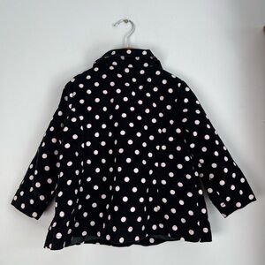 From the Tres Chic collection from 2010. This pea coat is black with pink polka dots and bows. Velcro closure. Collared. Really stunning!