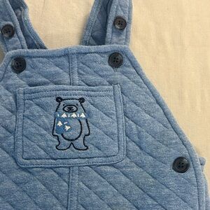 Adorable quilted overalls with bear design. Soft fabric for comfort. Snap closures for easy wear.