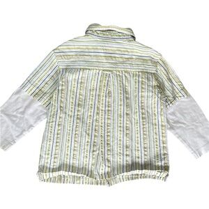 Green/yellow/white long sleeve button down shirt with insect print on the front pocket.
