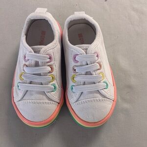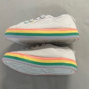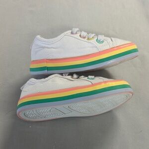 Brighten up your child's day with these vibrant kids sneakers. Featuring a playful rainbow stripe and a classic white base, these shoes are perfect for any adventure.
