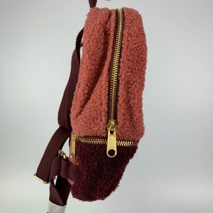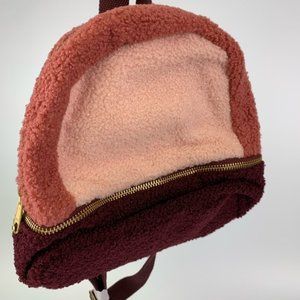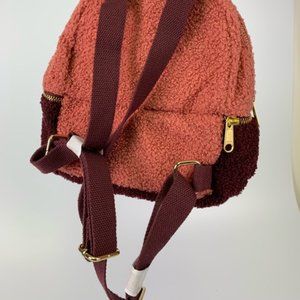 Gymboree colourblock sherpa mini backpack. Burgundy red / maroon and pink panels. Multiple compartments with gold zipper enclosures. Adjustable straps.