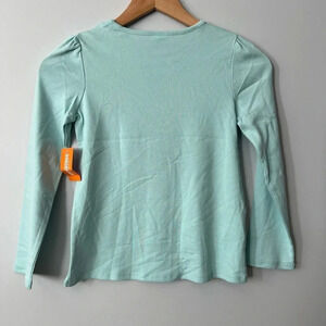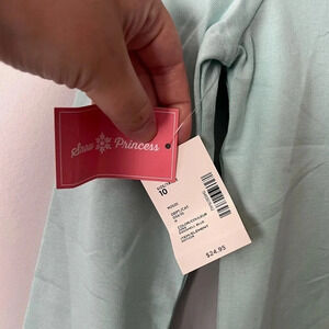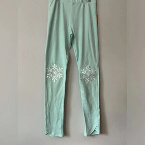 In good, new with tags condition. Both in the colour eggshell blue. The top features ice skate appliqué tied in a bow. The leggings have a tulip hem and feature snowflakes at the knees.