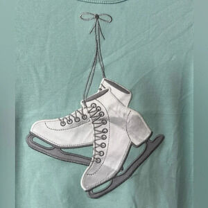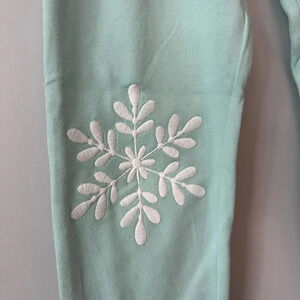 In good, new with tags condition. Both in the colour eggshell blue. The top features ice skate appliqué tied in a bow. The leggings have a tulip hem and feature snowflakes at the knees.