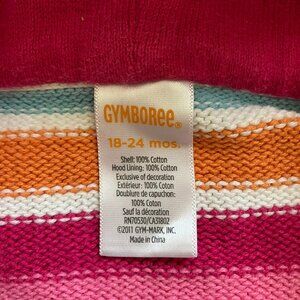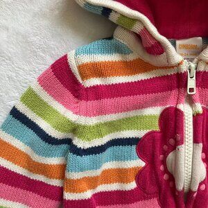 Gymboree sweater, size 18-24 months. Features bright rainbow stripes, soft cotton knit, full zip front, hood, and a flower embroidery detail on the front and elbows. Made of 100% cotton.