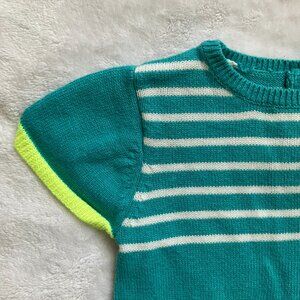 Gymboree knit dress, size 18-24 months. Features a teal base with white and teal stripes, accented with a playful embroidery-lined bird and peacock on the front, and neon yellow green trim on the sleeves and hem. Made of 92% cotton and 8% acrylic.