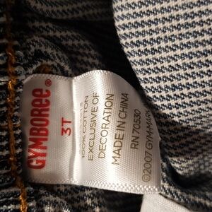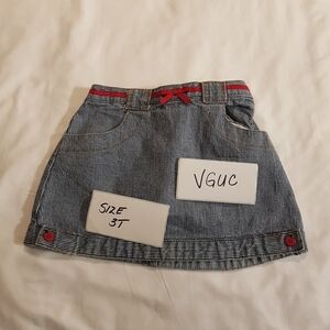 Gymboree girls size 3T Prep School line skirt, vertical stripes with cute apple buttons on the bottom corners, pull on style, red ribbon attached bow that looks like a belt, normal jean fade, back of waist is elastic