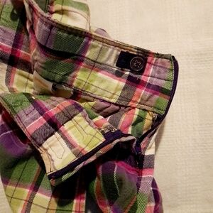 Gymboree girls size 8 plaid flannel skort, faux belt buckles, pink, purple, green & white, adjustable waist, minor wash wear