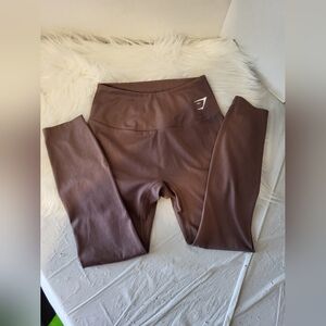 Stylish Gymshark high-waisted leggings in a taupe color. Perfect for workouts or casual wear.