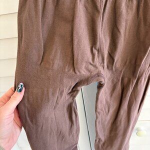 Similar to the matching sports bra. Best for yoga or non intense activities. Seem pulled slightly where the tag is